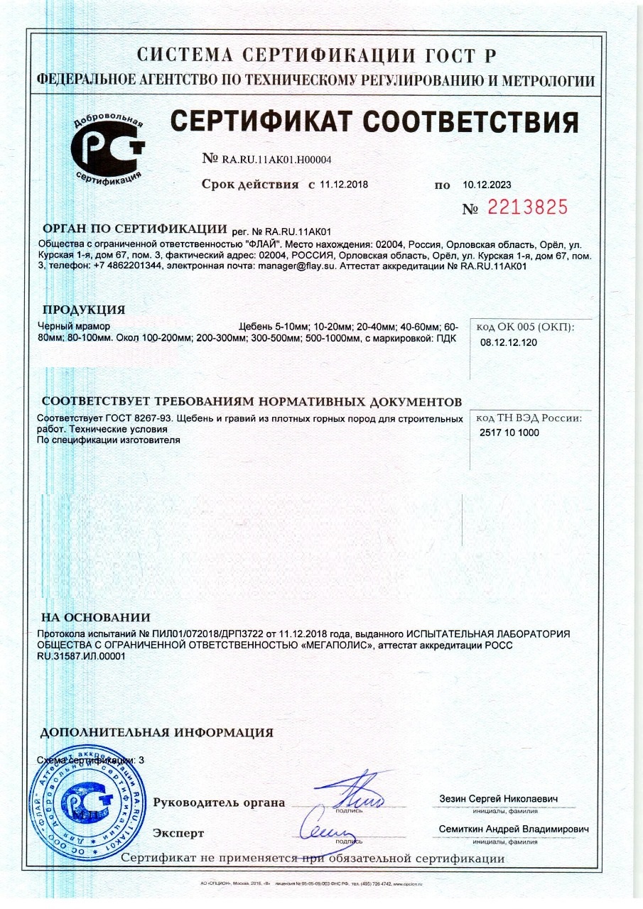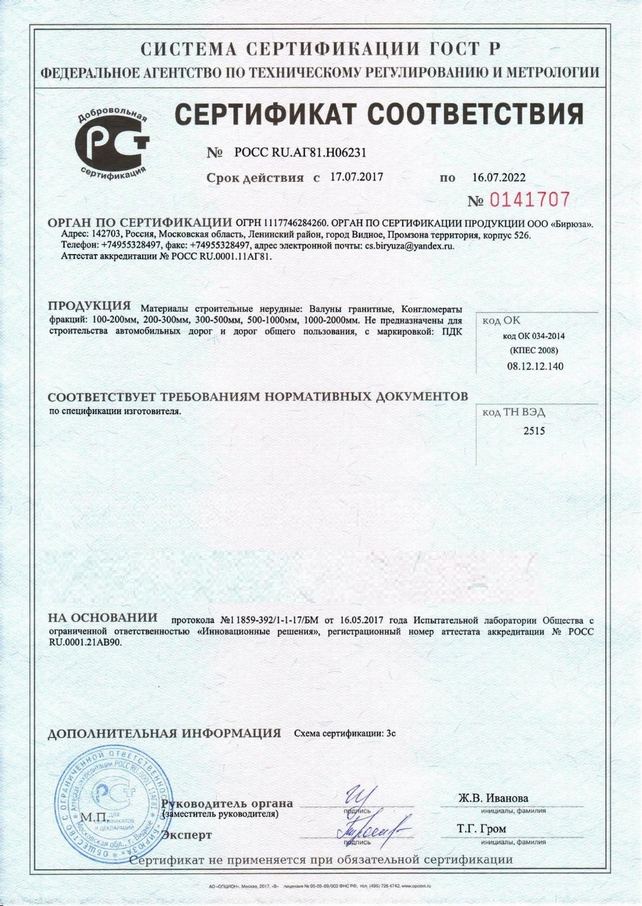 Сертификат соответствия – документ, подтверждающий соответствие продукции требованиям качества и безопасности, установленными для нее действующими стандартами и правилами. Наш камень, который Вы сможете заказать с доставкой в Кирове , обладает всеми необходимыми документами для реализации и при необходимости могут быть предоставлены все необходимые подтверждающие документы при поставке.